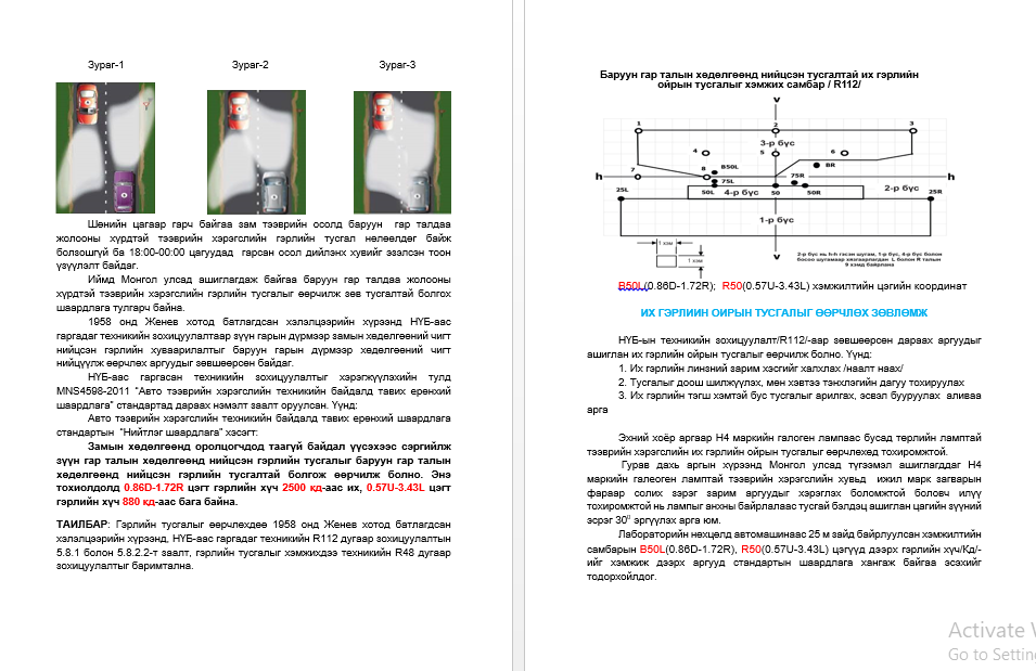 -1958 онд Женев хотод батлагдсан хэлэлцээрийн хүрээнд НҮБ-аас гаргадаг техникийн зохицуулалтаар зүүн гарын дүрмээр замын хөдөлгөөний чигт нийцсэн гэрлийн хуваарилалтыг баруун гарын дүрмээр хөдөлгөөний чигт нийцүүлж өөрчлөх аргуудыг зөвшөөрсөн байдаг. Бид НҮБ-аас гаргасан техникийн зохицуулалтыг хэрэгжүүлэхийн тулд MNS4598-2011 “Авто тээврийн хэрэгслийн техникийн байдалд тавих ерөнхий шаардлага” стандартад нэмэлт заалт оруулсан. Тодруулбал, Авто тээврийн хэрэгслийн техникийн байдалд тавих ерөнхий шаардлага стандартын “Нийтлэг шаардлага” хэсэгт, замын хөдөлгөөнд оролцогчдод таагүй байдал үүсэхээс сэргийлж зүүн гар талын хөдөлгөөнд нийцсэн гэрлийн тусгалыг баруун гар талын хөдөлгөөнд нийцсэн гэрлийн тусгалтай болгож өөрчилж болно. Энэ тохиолдолд 0.86D-1.72R цэгт гэрлийн хүч 2500 кд-аас их, 0.57U-3.43L цэгт гэрлийн хүч 880 кд-аас бага байна гэж... Өөрөөр хэлбэл, гэрлийн тусгалыг өөрчлөхдөө 1958 онд Женев хотод батлагдсан хэлэлцээрийн хүрээнд, НҮБ-аас гаргасан техникийн R112 дугаар зохицуулалтын 5.8.1 болон 5.8.2.2-т заалт, гэрлийн тусгалыг хэмжихдээ техникийн R48 дугаар зохицуулалтыг баримталсан.