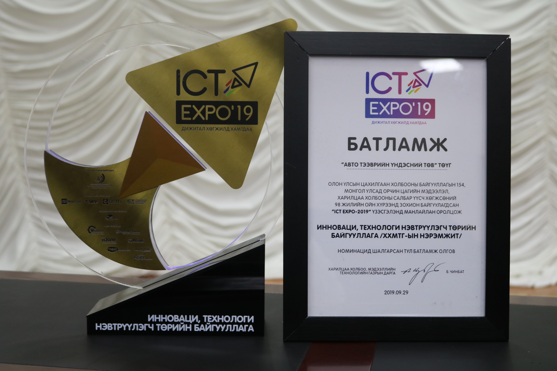 Засгийн газрын тохируулагч агентлаг – Харилцаа холбоо, мэдээллийн технологийн газраас 13 дахь жилдээ зохион байгуулж буй "ICT EXPO" үзэсгэлэнд Автотээврийн үндэсний төв ТӨҮГ “ШИЛДЭГ ИННОВАЦИ НЭВТРҮҮЛЭГЧ ТӨРИЙН БАЙГУУЛЛАГА”-аар шалгарлаа. “Дижитал хөгжилд хамтдаа” уриан дор зохион байгуулагдсан тус арга хэмжээнд төрийн болон хувийн хэвшлийн 40 гаруй байгууллагa оролцож, харилцаа холбоо, мэдээллийн технологийн дэвшил, шинэ бүтээгдэхүүн, үйлчилгээг олон нийтэд танилцуулж, шилдгүүдээ шалгаруулсан юм. Энэхүү үзэсгэлэнд Шилдгийн шилдэг оролцогч, Шилдэг технологи шийдэл, Шилдэг бүтээгдэхүүн, Шилдэг үйлчилгээ, Шилдэг үндэсний контент, Шилдэг гарааны бизнес - старт-ап, Нийгмийн хариуцлагатай байгууллага, Мэдээлэл, харилцаа холбооны шилдэг судалгаа, Инноваци, технологи нэвтрүүлэгч төрийн байгууллага, Шилдэг зохиомжит талбай гэсэн 10 номинацид шилдгүүдийг шалгаруулсан юм.