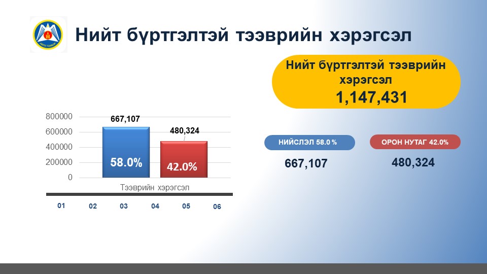 2023.05.31-ний өдрийн байдлаар улсын хэмжээнд бүртгэлтэй нийт 1.152.069 тээврийн хэрэгсэл бүртгэлтэй байна.