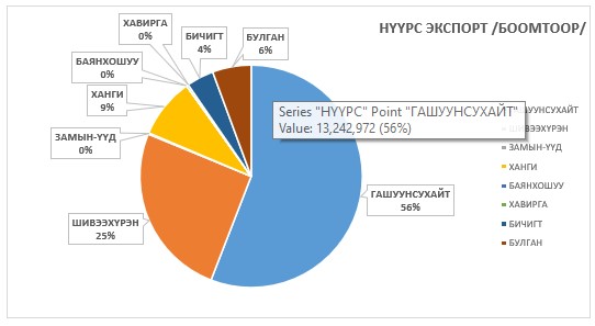 Оны өссөн дүнгээр Гашуунсухайт боомтын чиглэлд нийт 113090 тээврийн хэрэгслээр 13,2 сая.тн нүүрс буюу нийт автотээврээр нүүрс экспортын 56%, Шивээхүрэн боомтын чиглэлд 48295 тээврийн хэрэгслээр 5,9 сая.тн нүүрс буюу нийт автотээврээр нүүрс экспортын 25%, Дорноговь аймгийн Ханги боомтын чиглэлд 28288 тээврийн хэрэгслээр 2.07 сая.тн нүүрс буюу нийт автотээврээр нүүрс экспортын 9%, Ховд аймгийн Булган боомтын чиглэлд 15833 тээврийн хэрэгслээр 1.4 сая.тн нүүрс буюу нийт автотээврээр нүүрс экспортын 6%, Сүхбаатар аймгийн Бичигт боомтын чиглэлд нийт 12792 тээврийн хэрэгслээр 0.9 сая.тн нүүрс буюу нийт автотээврээр нүүрс экспортын 4%-ийг тус тус эзэлж байна.
