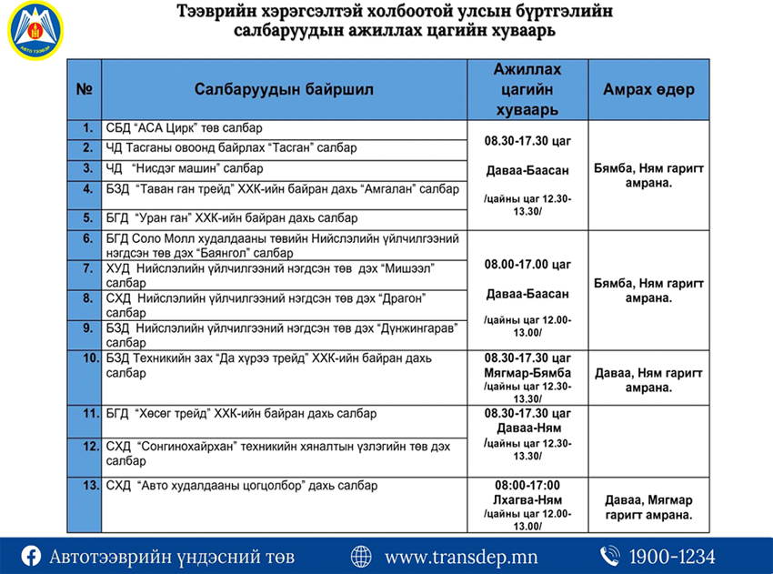 Тээврийн хэрэгсэлтэй холбоотой улсын бүртгэлийн салбарын ажиллах цагийн хуваарь