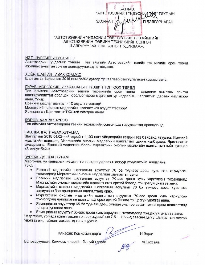 Төв аймгийн автотээврийн төвийн техникчийг сонгон шалгаруулах шалгалтын удирдамж