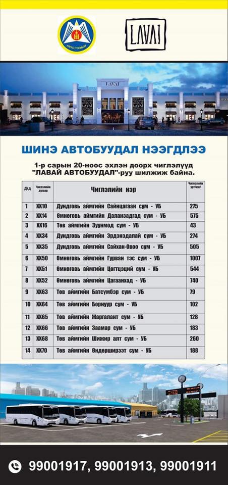 Хот хоорондын нийтийн зорчигч тээврийн Төв, Өмнөговь, Дундговь аймаг чиглэлийн үйлчилгээ 2019 оны нэгдүгээр сарын 20-ны өдрөөс эхлэн Хан-Уул дүүрэгт байрлах “ЛАВАЙ АВТО БУУДАЛ”-д шилжүүллээ. Иймд тус чиглэлүүдэд зорчих иргэд үйлчлүүлэгч та бүхэн “Лавай” шинэ автобуудлаар үйлчлүүлээрэй.