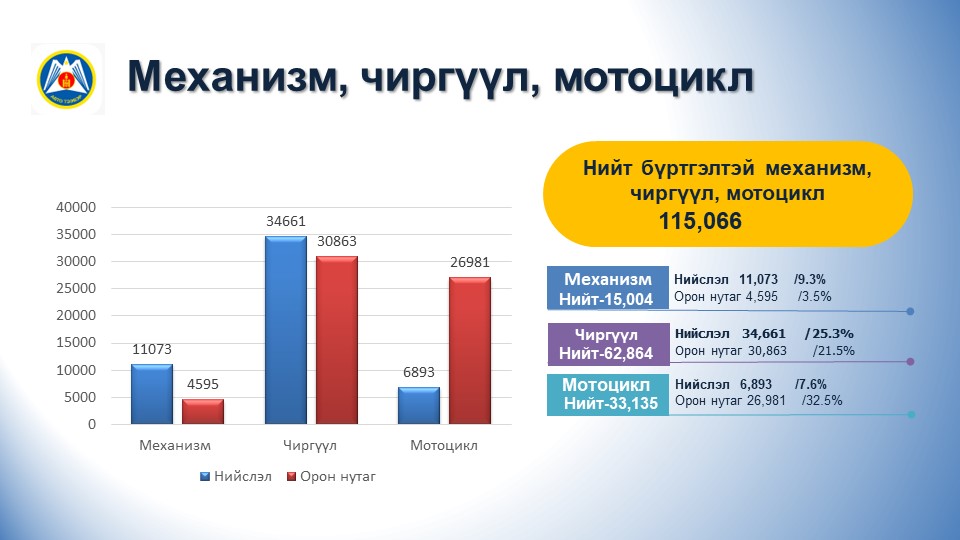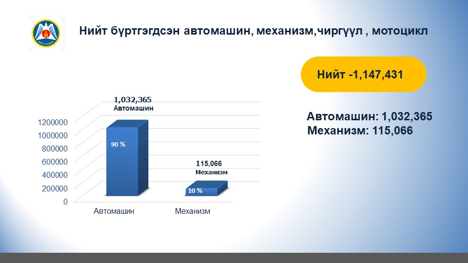 2023.05.31-ний өдрийн байдлаар улсын хэмжээнд бүртгэлтэй нийт 1.152.069 тээврийн хэрэгсэл бүртгэлтэй байна.