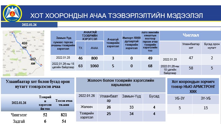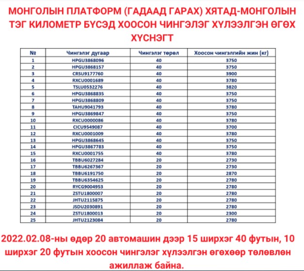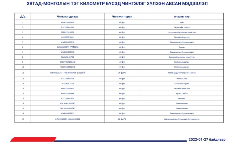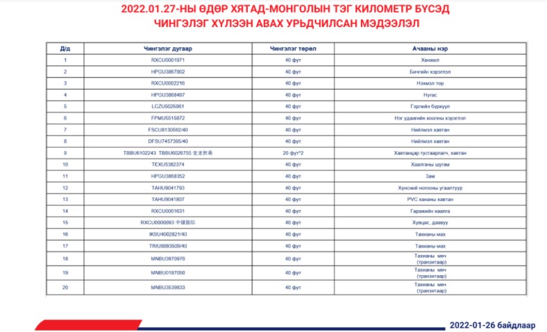 2022.01.27-ны өдөр Хятад - Монголын тэг километр бүсэд чингэлэг хүлээн авах урьдчилсан мэдээлэл