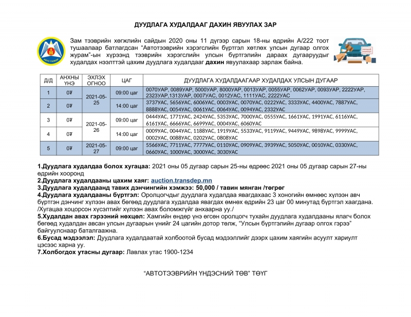 Тээврийн хэрэгслийн улсын дугаарын ДУУДЛАГА ХУДАЛДААГ ДАХИН ЯВУУЛАХ ЗАР #5 Cери - УАР, УАС