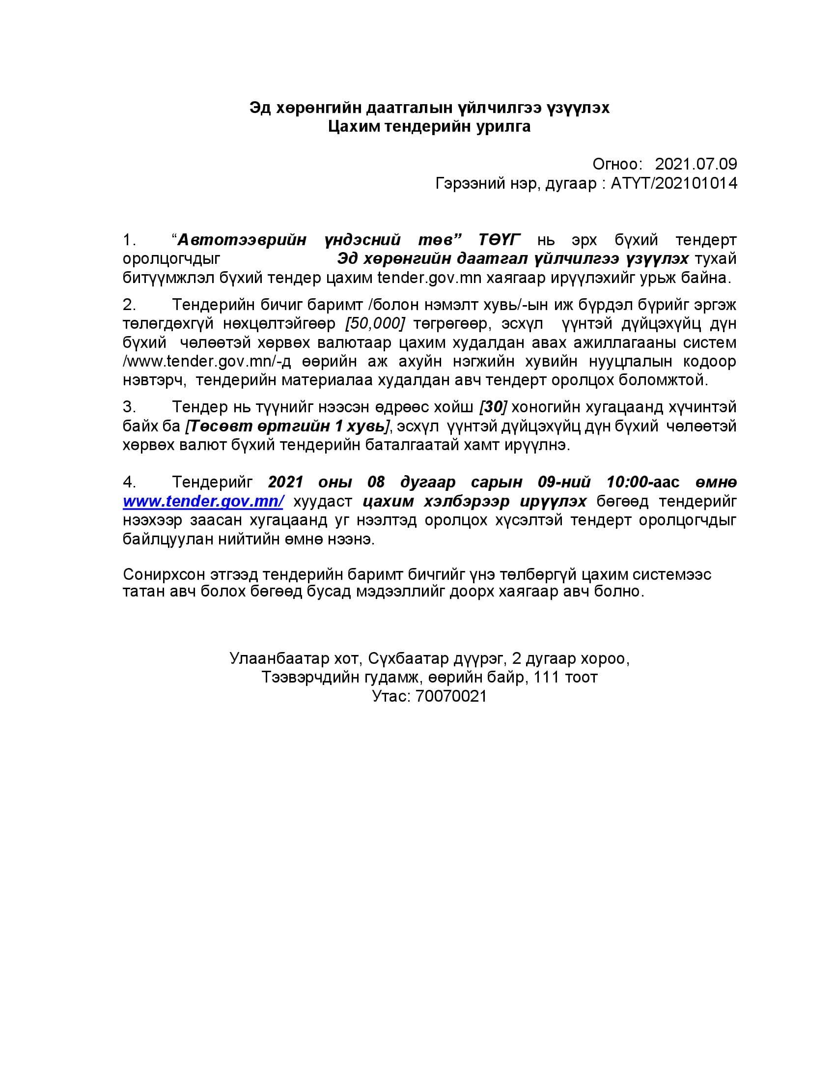 ТЕНДЕРИЙН УРИЛГА /2021.07.02/